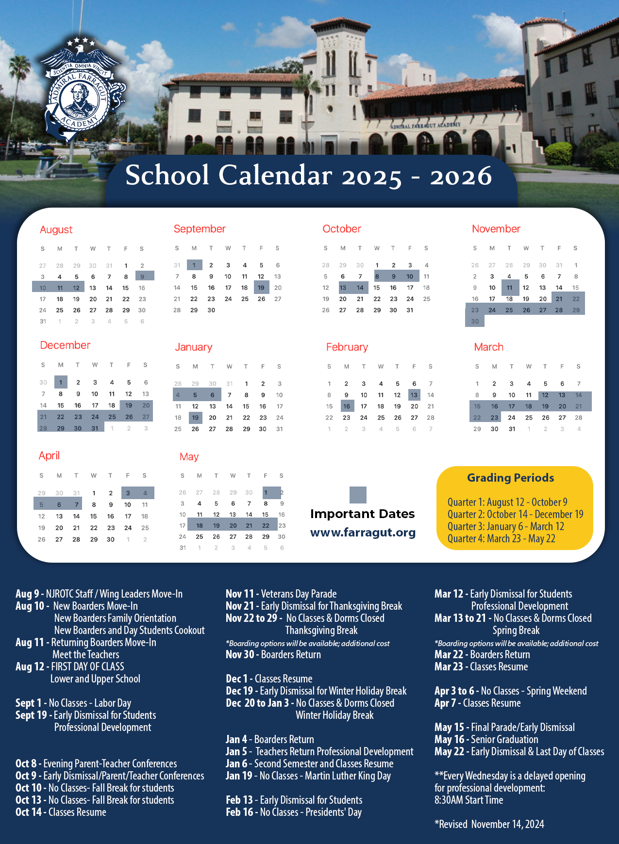 At Admiral Farragut Academy, our school calendars are thoughtfully designed to keep our community connected and informed. They feature events across every aspect of school life, including Academics, Schoolwide activities, Upper School and Boarding Life, as well as Lower School. This comprehensive approach ensures families, students, and staff can easily stay engaged with all that’s happening on campus.